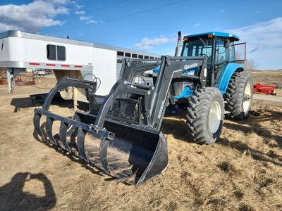 1997 New Holland 8670 MFWA Diesel Tractor, 4754 total hours. 3107 hrs before cluster change,1647 hrs after change, 4754 total hrs. 1000/540 PTO, Quad hydraulics, drawbar, rear window rock shield, with Quicke Q990 Front End Loader with 100" bucket with teeth and grapple, 150hp, 420/85R28 front rubber, 520/85R38 Rear Rubber. |