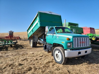 1992 GMC TopKick SLE Single Axle Diesel Grain Truck, s/n: 1GDL7H1J4NJ524599 with 16' Steel box and Harsh Hoist, 54" sides, IP Roll over tarp, CAT Diesel Engine, Automatic transmission, AUX hydraulics, side tool box, 27,633kms |