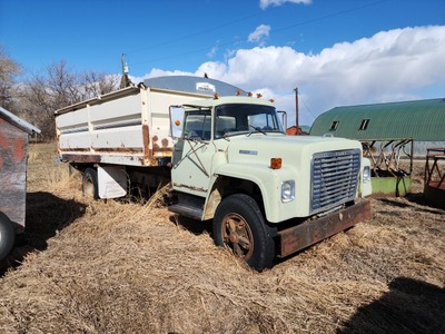 1975 International Loadstar 1700 Single Axle Grain Truck with 15' steel box with silage end gate, s/n: D0522ECA22973 Steel box and hoist with silage end gate, roll over tarp, gas motor, 4 and 2 trans, 71,710 miles showing, hasn't ran in 10 years brakes are bad, buy as is. |